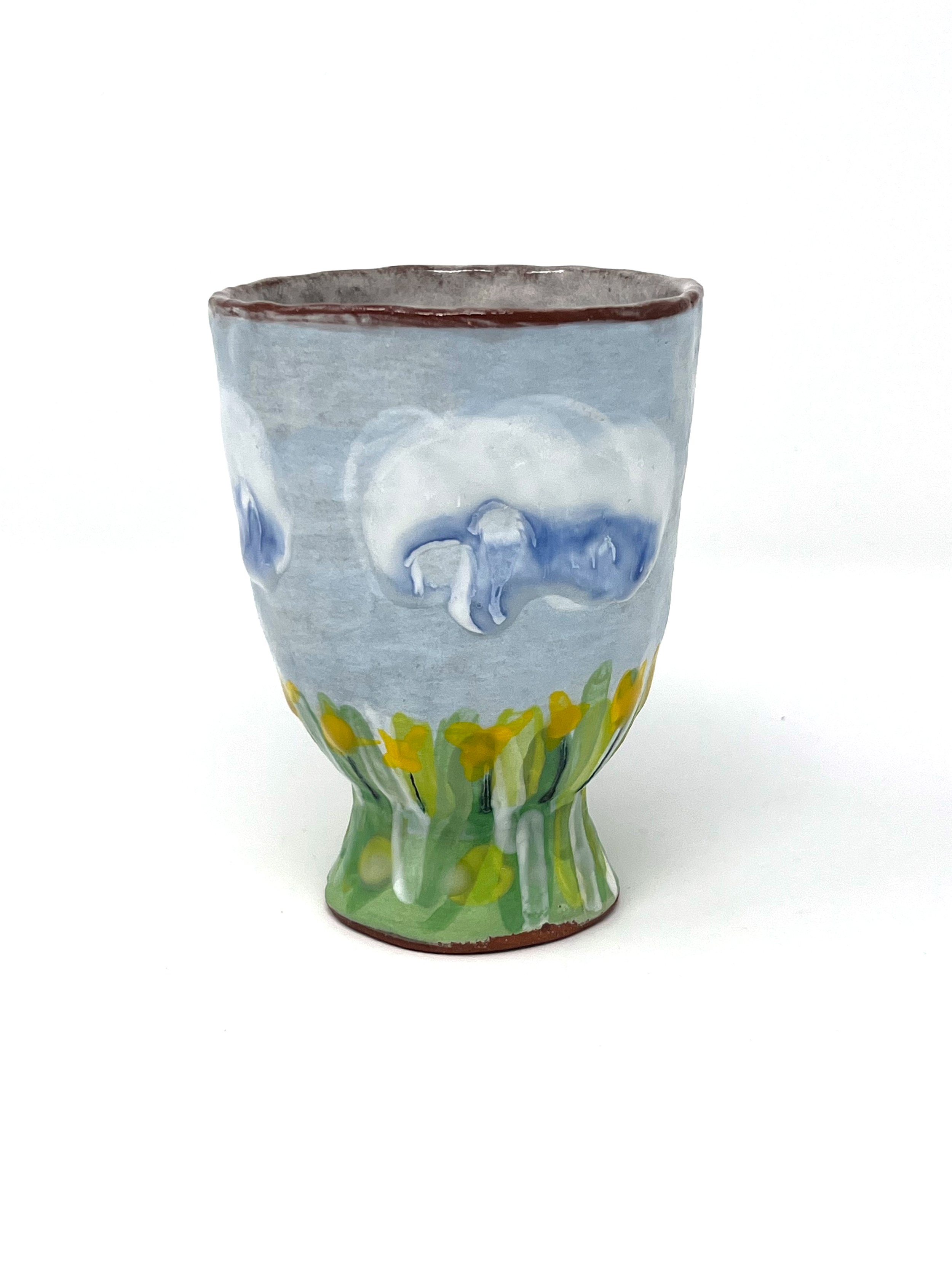 Coil-built earthenware clay with slip, hand painted underglazes and free hand sgraffito drawing. One-of-a-kind cup.