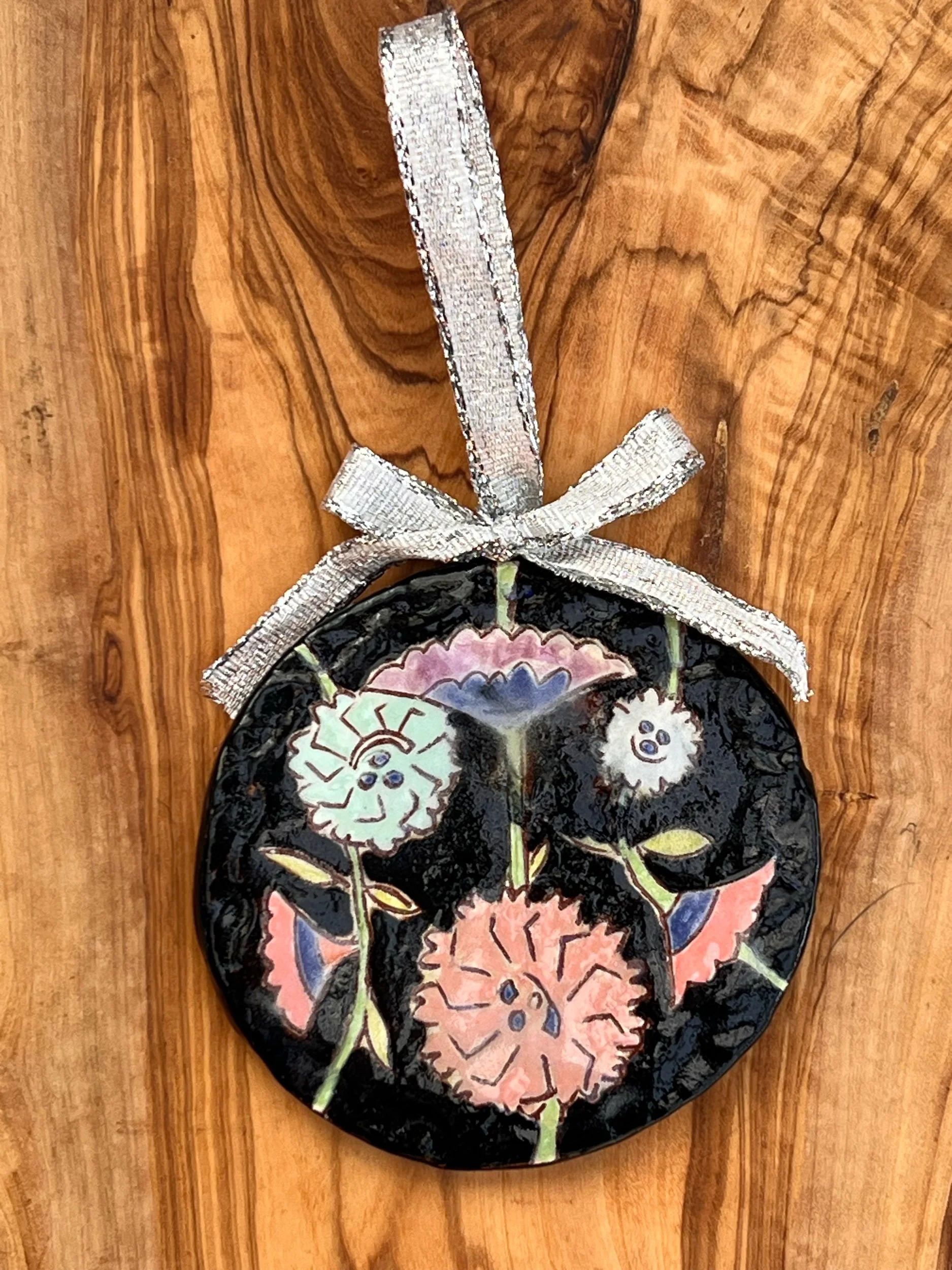 Red earthenware clay with slip, hand painted underglazes and free hand sgraffito drawing. Flat, unglazed, smoothly sanded bottom. Wire for hanging. One-of-a-kind tile.