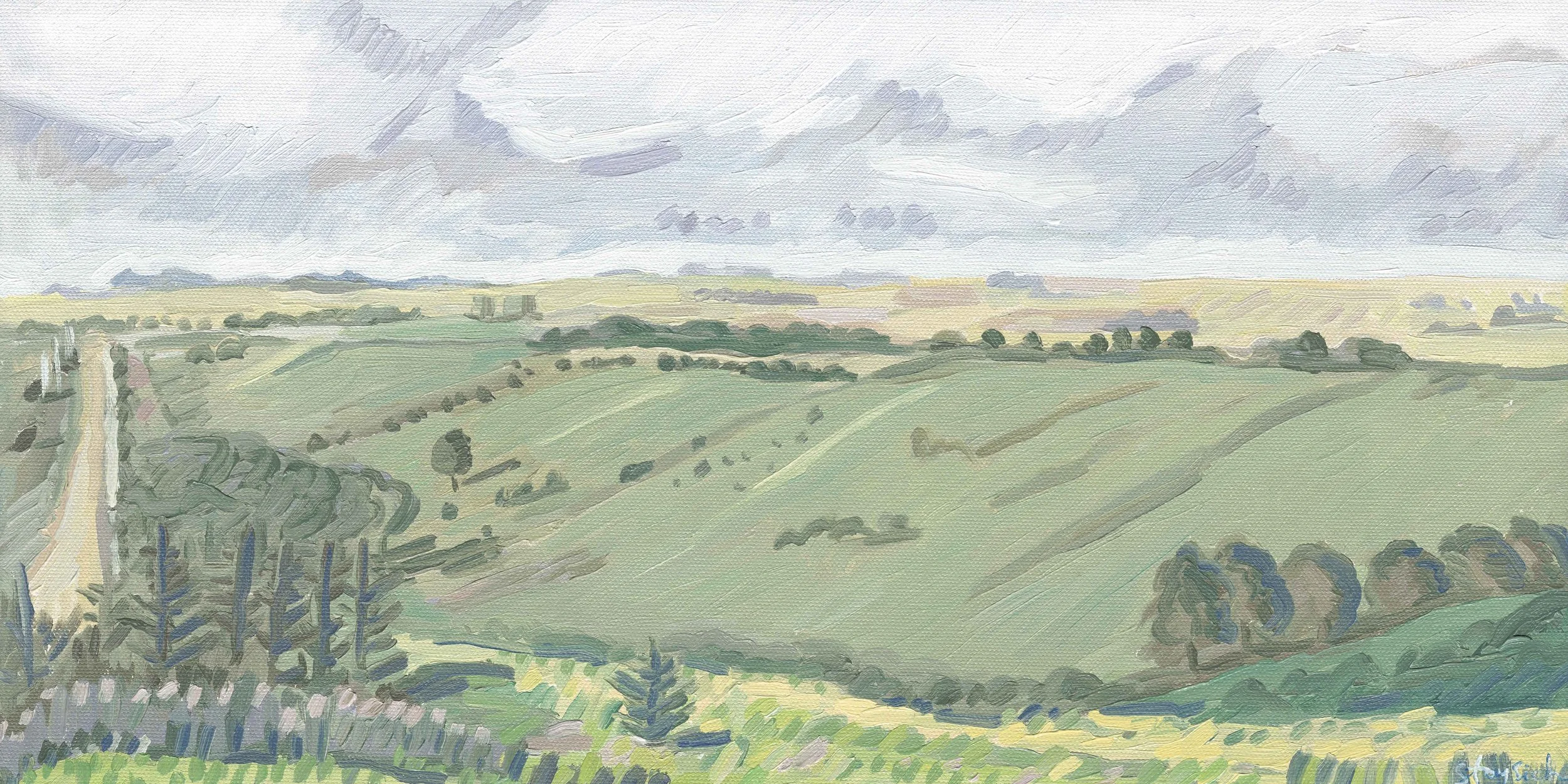 Oil on Canvas, slight impasto texture. One-of-a-kind original painting. Painting extends to all short edges of the canvas. This is a painting of a country road on the Loess Hills National Scenic Byway. Signed by Anna Stoysich.